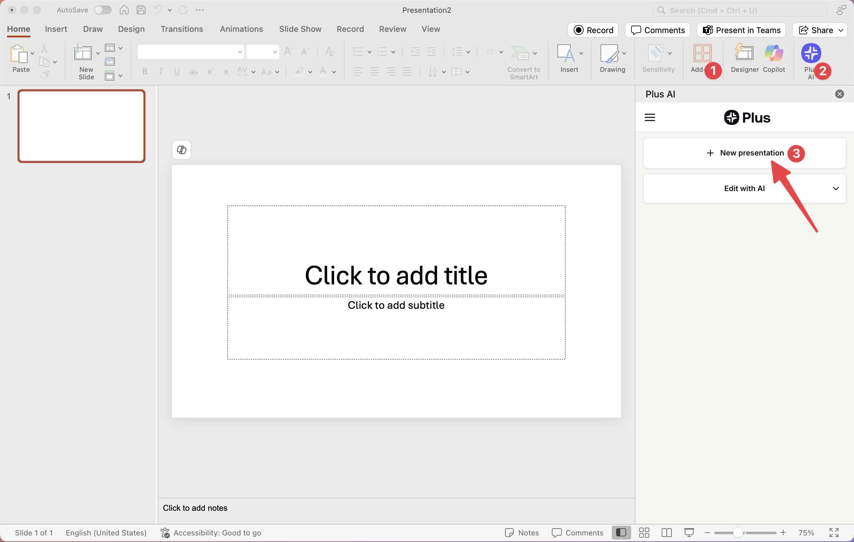 - Open a New Presentation, go to the Home tab, and click Plus AI in the ribbon. (If it does not appear, click Add-ins and search for Plus AI)