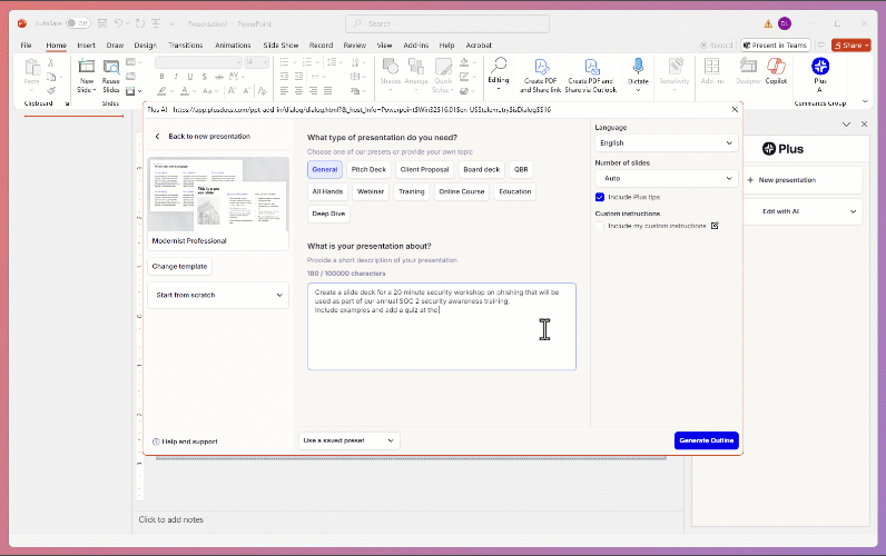While there are plenty of AI presentation makers on the market, Plus AI is a native add-in for PowerPoint that adds AI functionality to PowerPoint. Plus AI generates high-quality, professional outputs, and it is fully compatible with your existing presentation workflows.