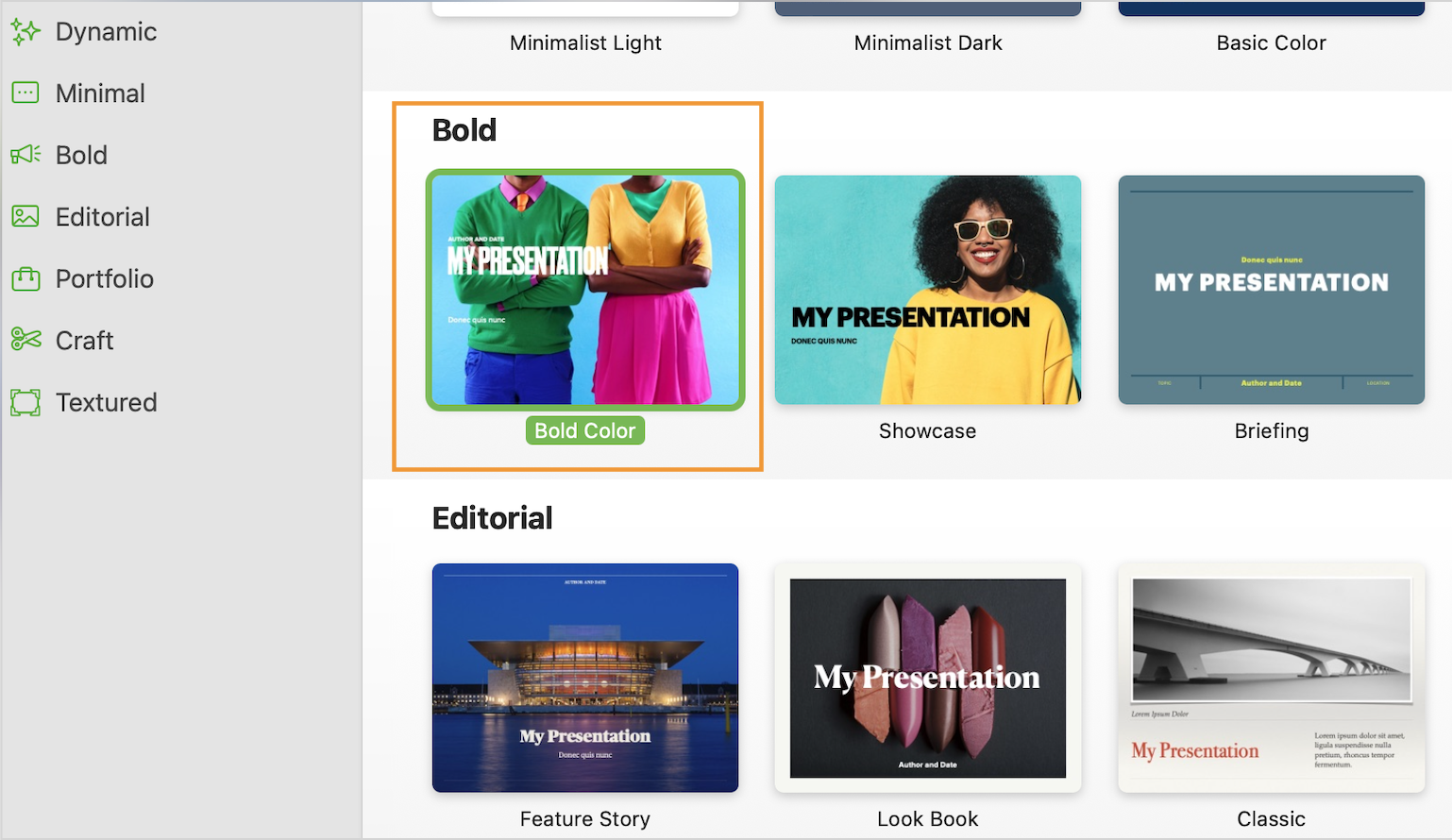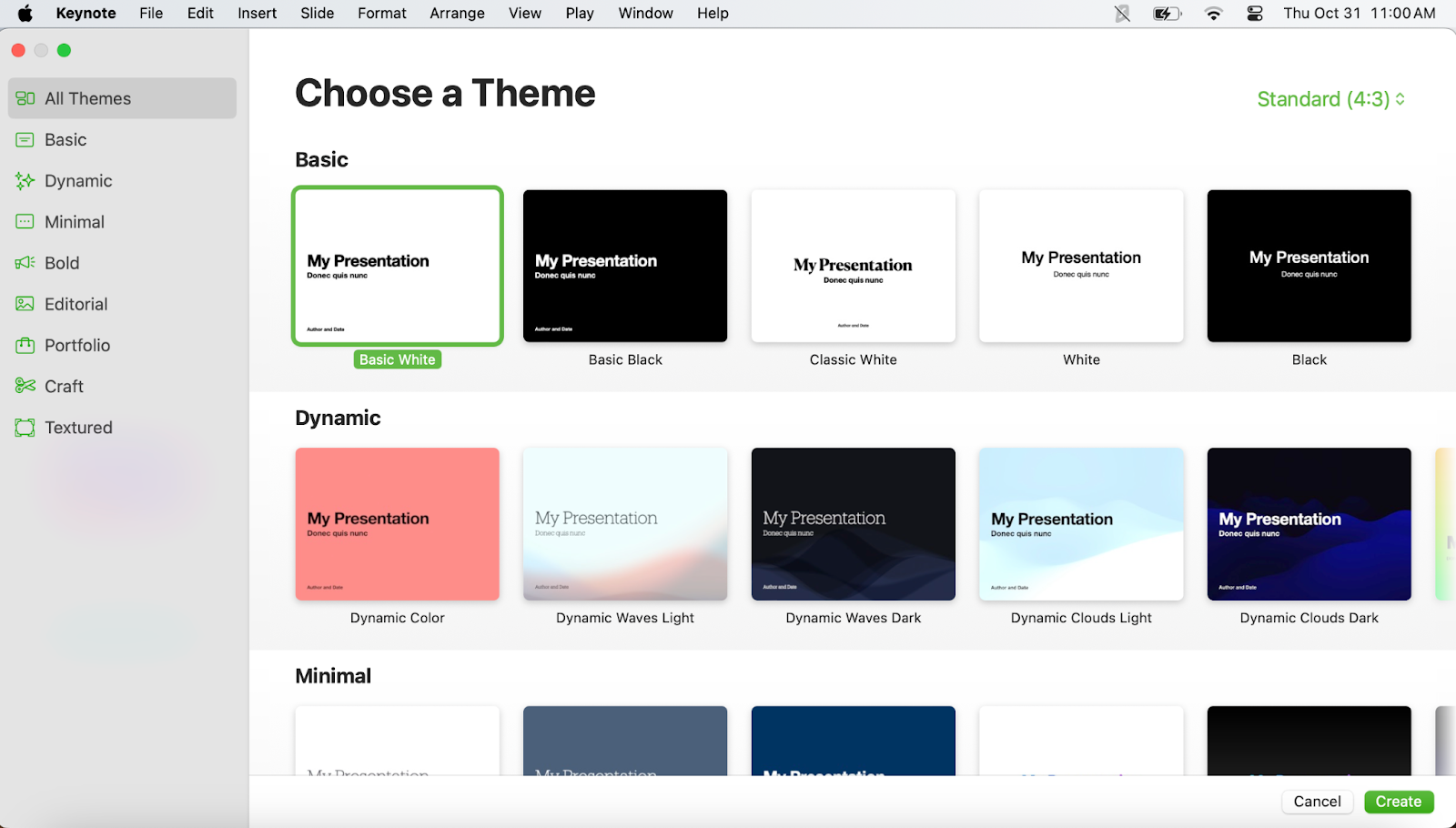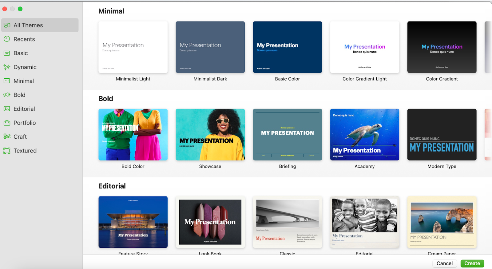 Keynote doesn’t have an AI-powered design assistant like PowerPoint, but it does equip you with a decent library of attractive templates. Whether you’re looking for a more minimalist theme, or want to go all out with bold colors, there’s probably a theme that suits your fancy: