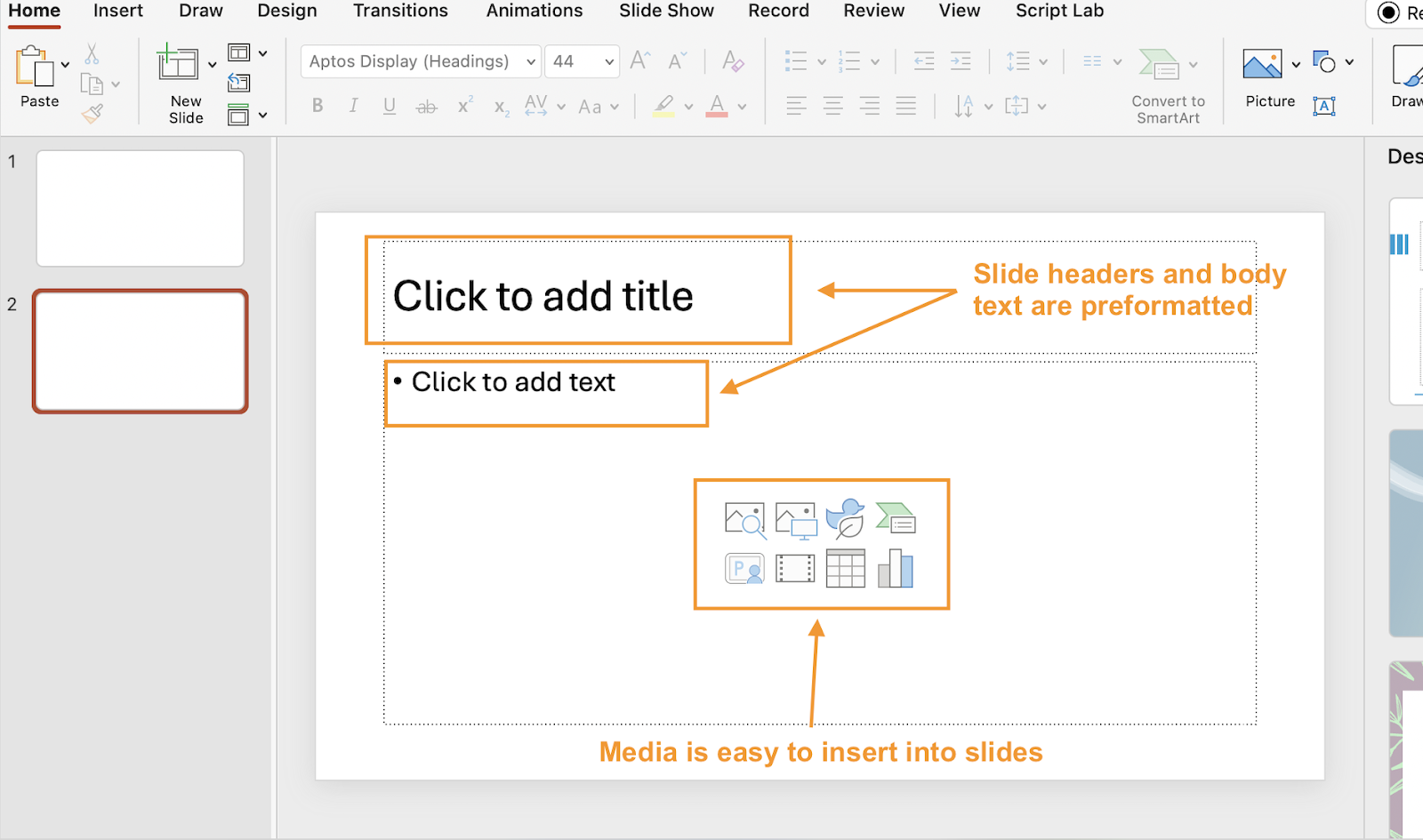 Once you open PowerPoint, the user interface greets you with all the features you need to start building your slide deck quickly. Slide formatting is usually a time-consuming task. PowerPoint tries its best to alleviate the tedium by starting you off with a basic default template where the headers and body text are preformtted, and inserting media is just a click away: