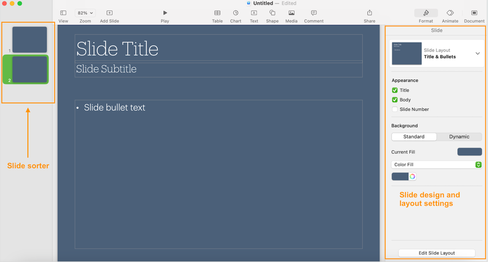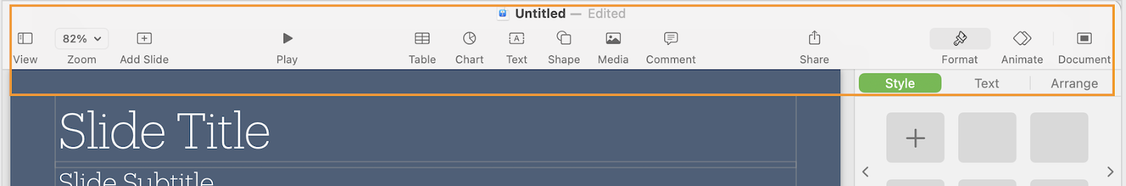 If you’ve never used Keynote before, you won’t need to “learn” this part of the interface — it’s arranged so intuitively that finding the function you need takes little mental effort.