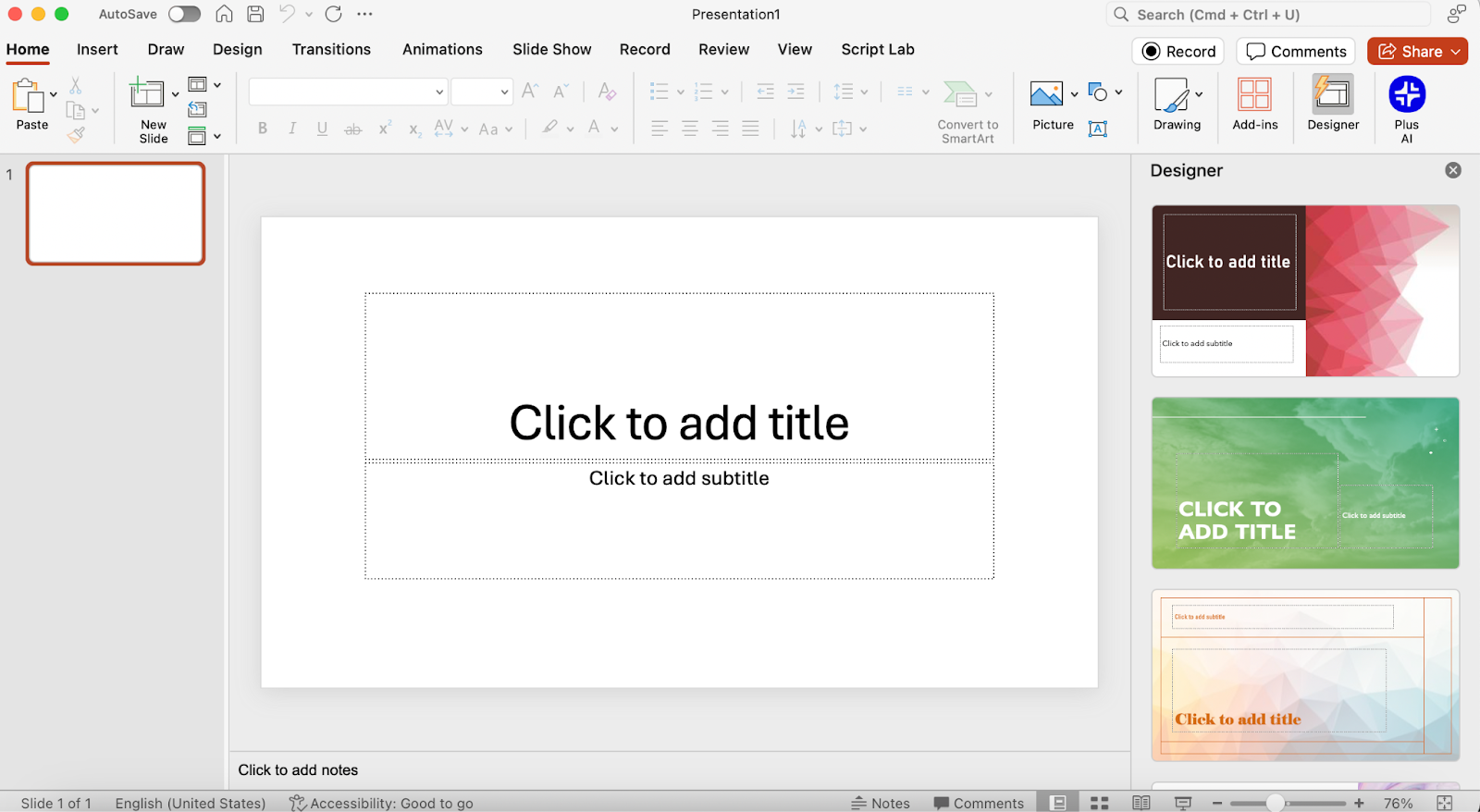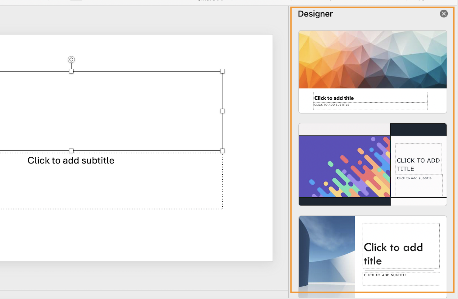 Meanwhile, the right sidebar features PowerPoint’s Designer, a feature that lets you quickly select from a range of slide templates and themes: