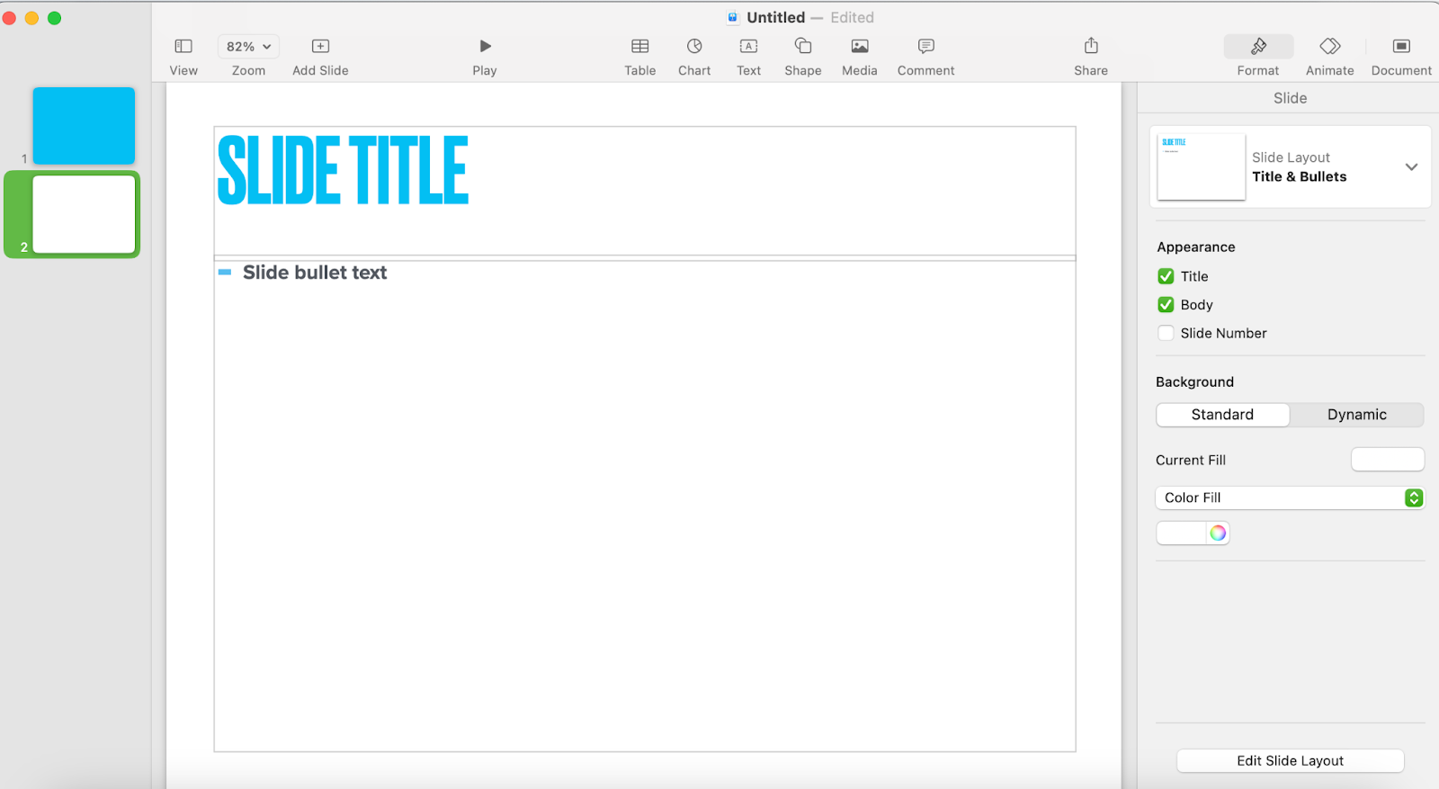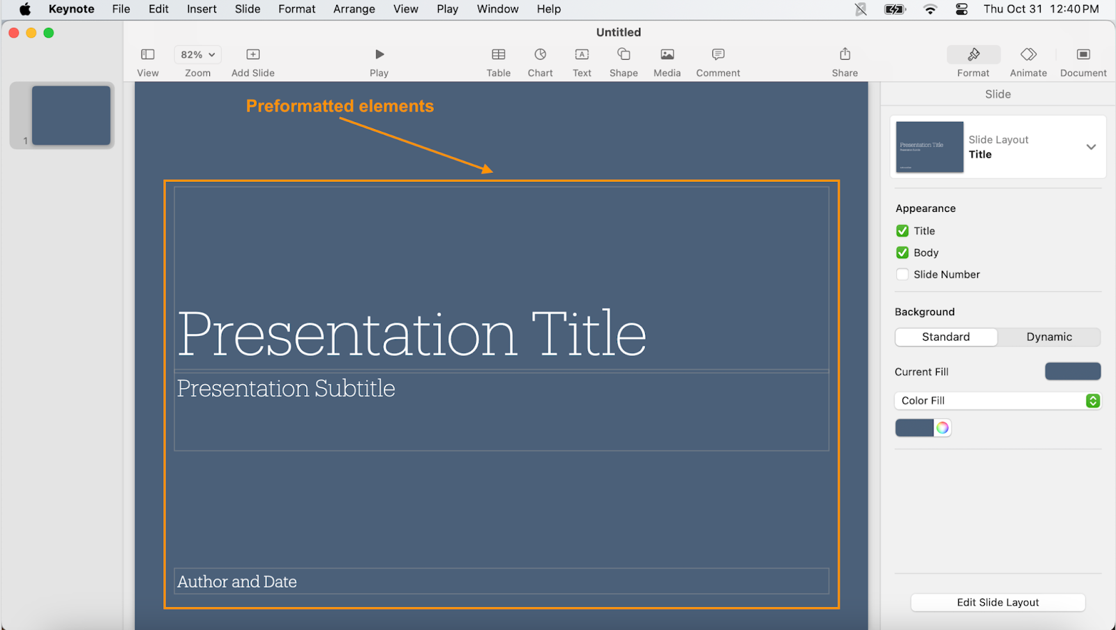 Keynote’s user interface is decidedly less cluttered than PowerPoint’s. Once you select a template, you’ll see the title slide with preformatted header and body text, much like you would in a PowerPoint presentation: