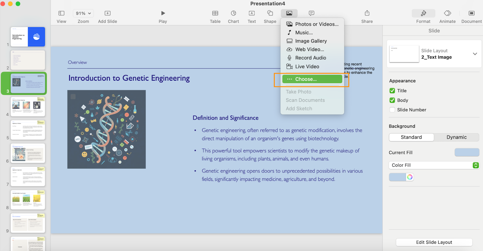 Like PowerPoint, Keynote allows you to insert images, videos, audio, and other types of media into the slide deck. What stands out about Keynote is how easy it is to just choose the file you want on your computer and insert it. Where PowerPoint wants you to specify what type of file you’re inserting, all you need to do on Keynote is click “Choose” under the Media tab, and insert any saved file you like: