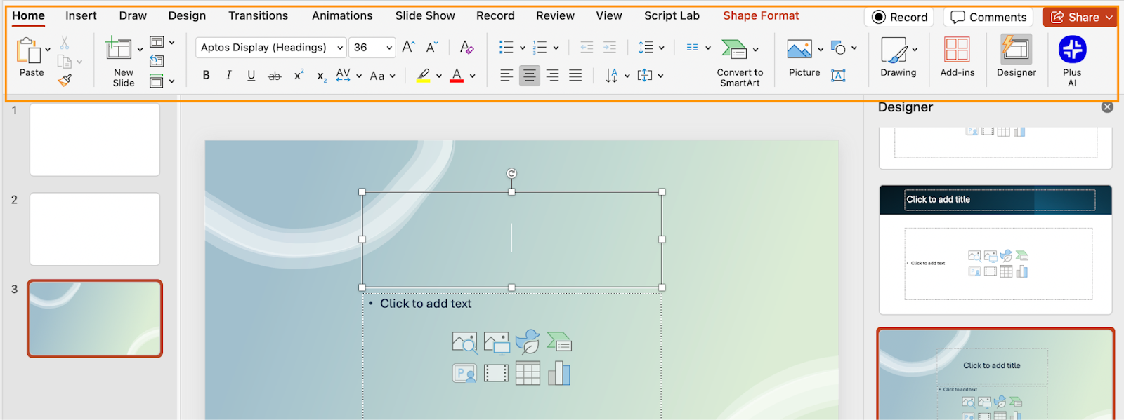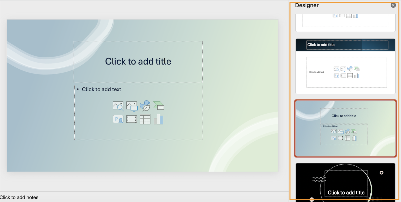 PowerPoint’s most vital design feature is the Designer. This AI-powered feature is configured to automatically generate and suggest themes and layouts based on the text you type on the slide and the graphics you add. In theory, it means that your selection of themes is virtually unlimited. In practice, it’s not always so.
