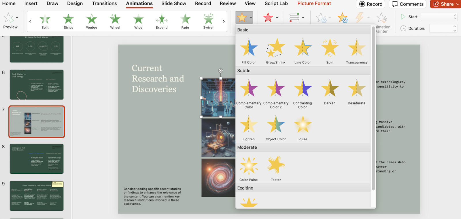 To add some oomph to the slides themselves, use the Animations tab. Here, you can make slide elements and appear and disappear in various creative ways. Likewise, the Animations tab lets you use effects emphasize graphics or text: