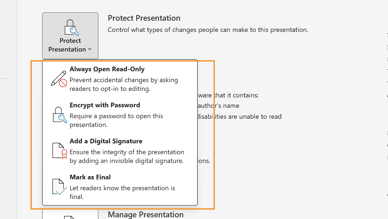 PowerPoint affords several effective ways to protect your presentations from unauthorized use with a number of features. Some, like PowerPoint’s Read-only and Mark as Final features, are meant to discourage editing by users with whom the presentation author shared the PPT file. Others, like password encryption and digital signatures, offer more robust security measures that preserve the presentation’s integrity and validate its authorship.