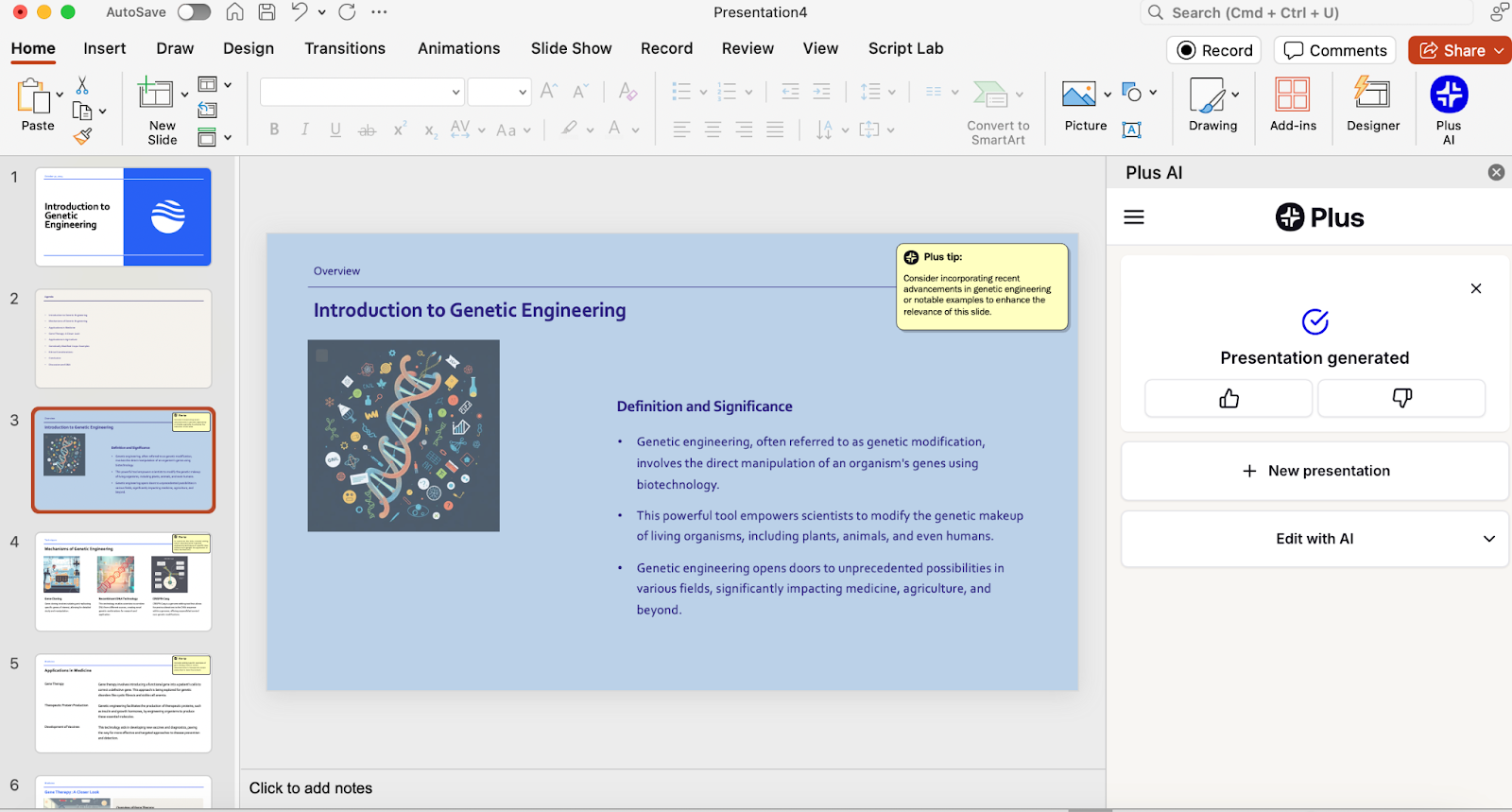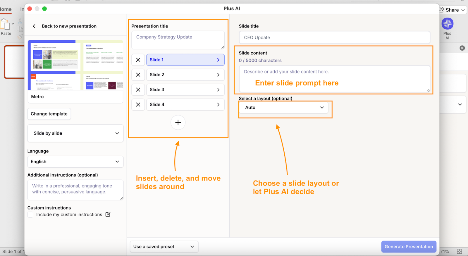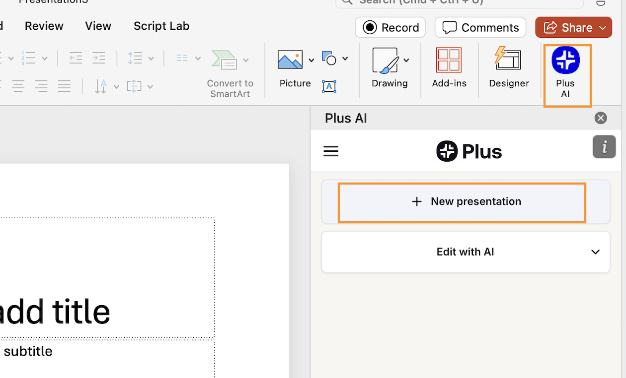 Install Plus AI as an add-in in PowerPoint, and you’ll be able to make and edit presentations with speed and efficiency.