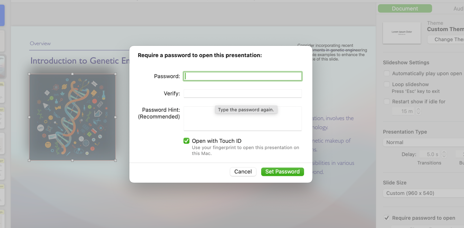 Apple Keynote offers a single, yet robust method to protect a presentation you’ve made — by encrypting it with a password: