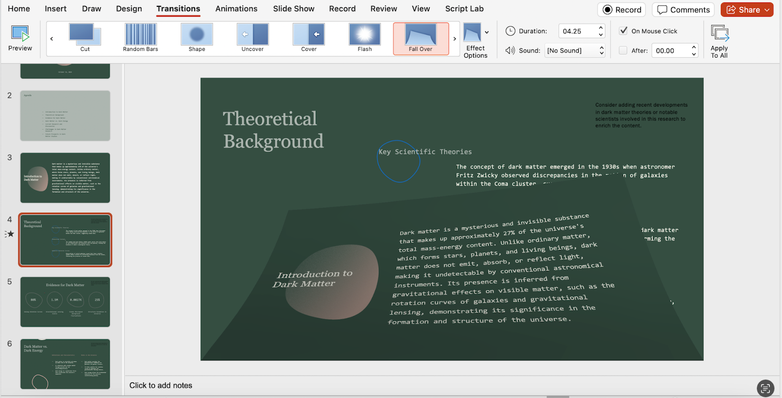 No presentation is complete without effective and engaging slide transitions and effects. You’re able to add transitions between the slides in the deck using PowerPoint’s Transitions tab. Microsoft’s slide maker offers a good selection of transitions, ranging from run-of-the-mill effects like Fade-In to more unique ones, like “Fall Over:”
