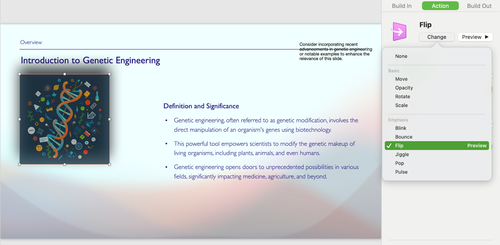 Much like PowerPoint, Keynote lets you add effects to how slides and objects appear, disappear, and behave when they’re on the screen. These features are called “build-in”, “build-out,” and “action,” respectively, and they’re housed under the Animate tab.