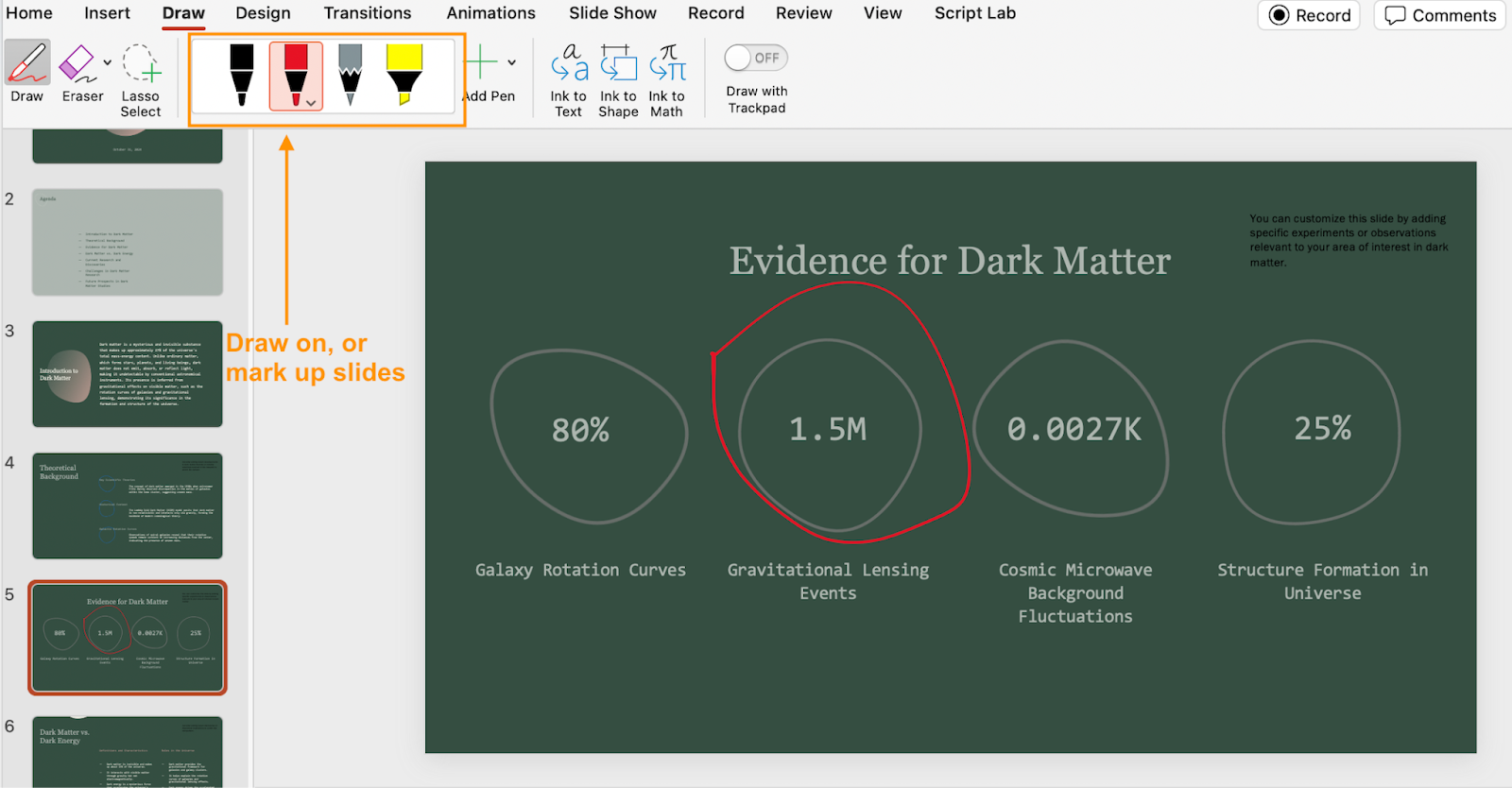 Conveniently, PowerPoint allows you to mark up slides and create your own drawings right in the presentation, instead of inserting them as an image. You can do so using features under the Draw tab: