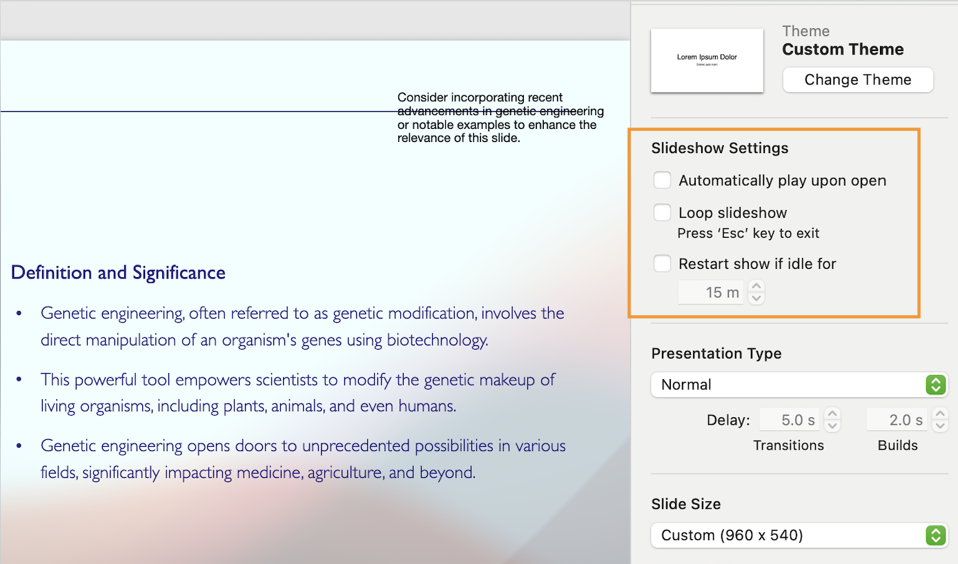 Unlike PowerPoint, Keynote’s slideshow preparation tool suite is quite modest. The only things Apple’s presentation lets you do to get the deck ready for the big day is decide whether the slideshow starts, whether it loops, and if it restarts after being idle: