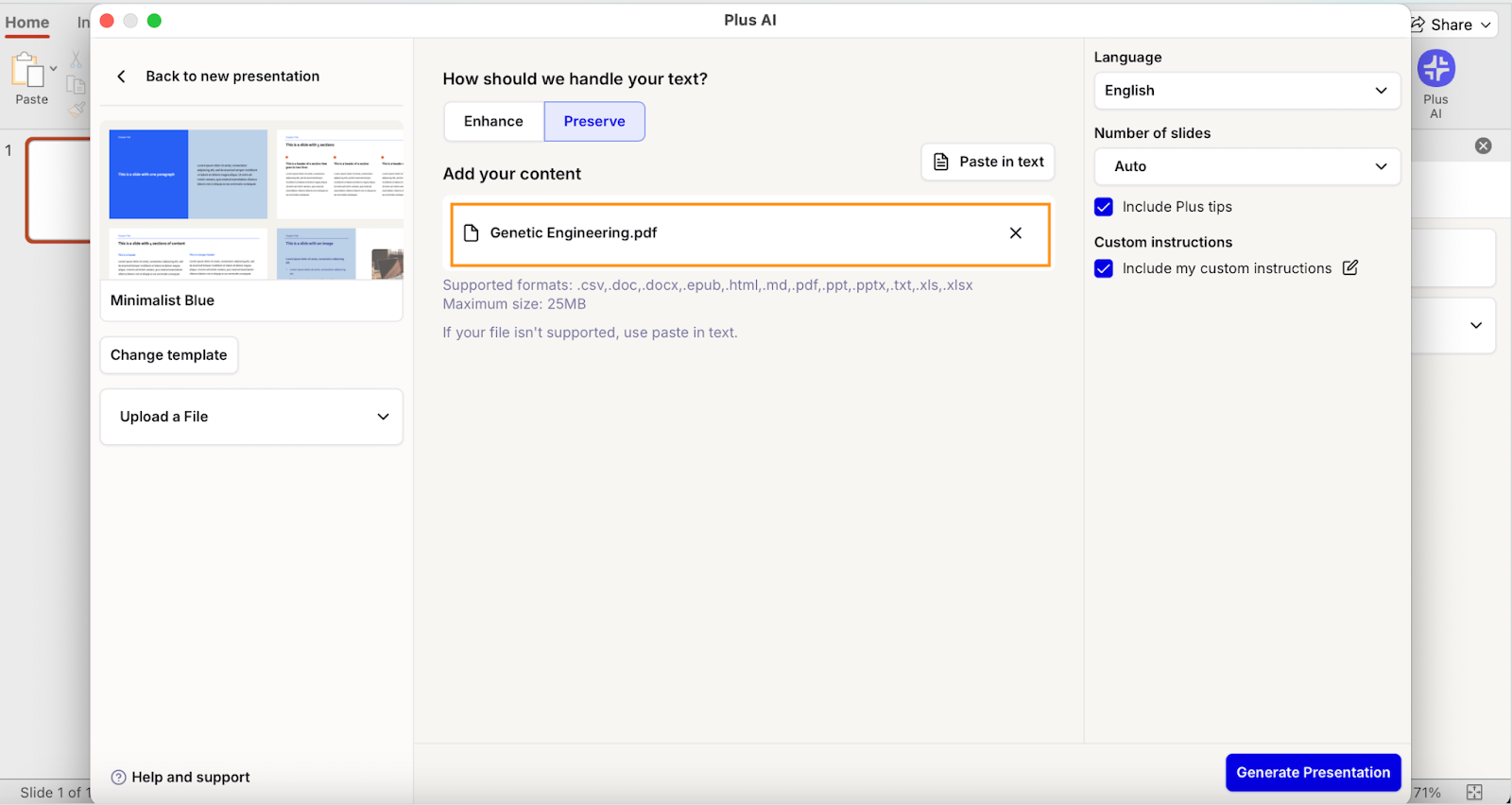 Plus AI will process the document, map information to slides, choose suitable layouts, and produce a complete PowerPoint presentation in its output: