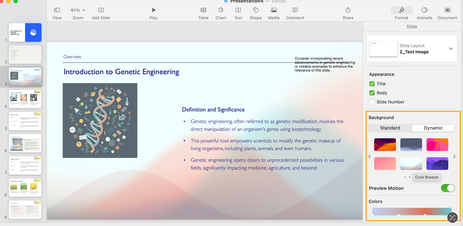 And if you’re looking beyond color for ways to enliven the slides, consider trying Keynote’s dynamic themes. These add some motion to the slide backgrounds.