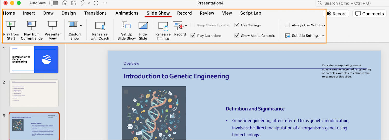 One of the handiest features is “Rehearse slide timings,” which lets you rehearse the slideshow in presenter mode and adjust the timing of each slide as you see fit:
