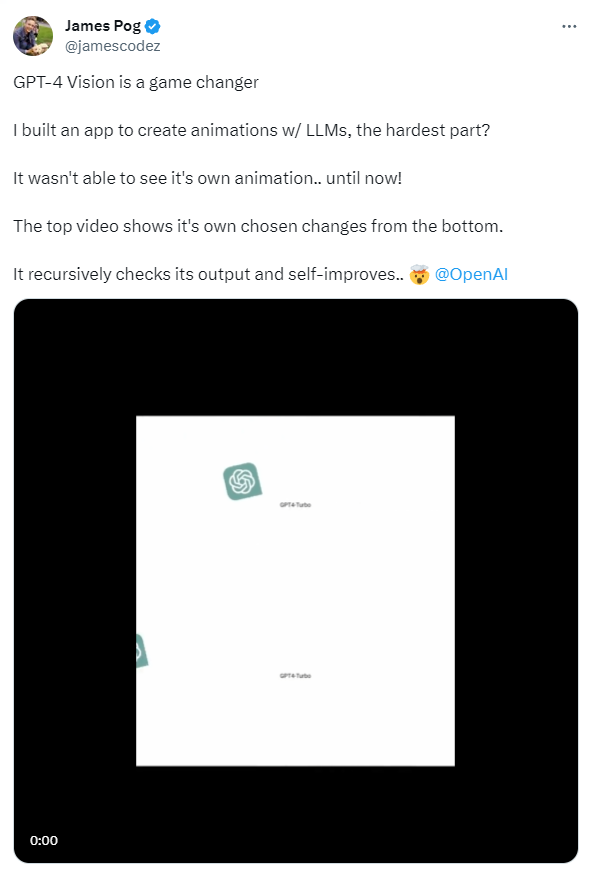 Taking this idea to the next level, @jamescodez built a tool to use GPT-4 to create animations, then self-adjust the outputs to enhance the animations by itself!