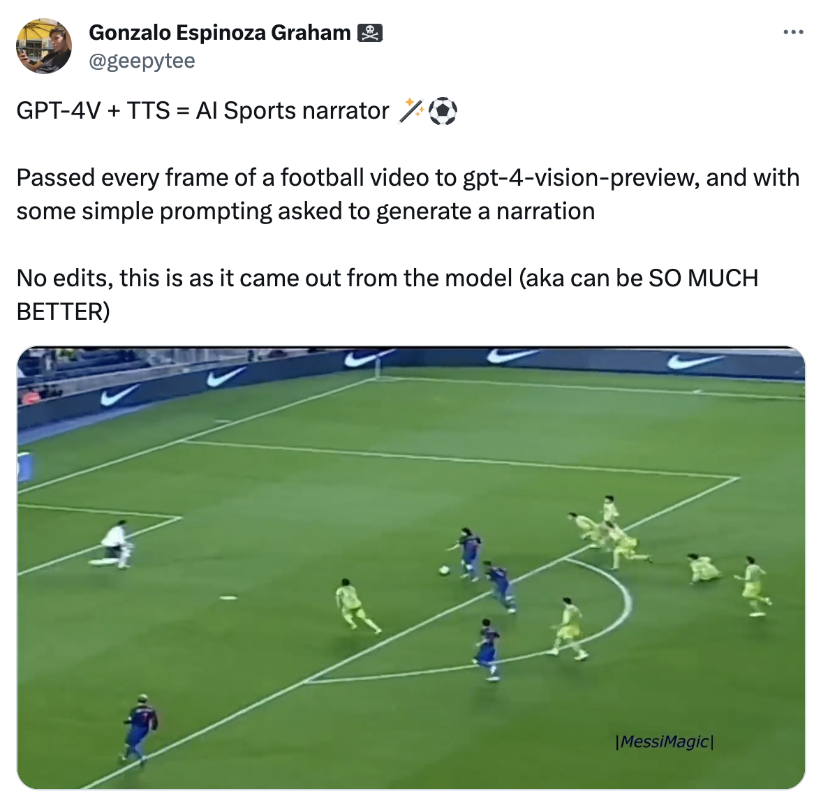 @geepytee created an AI sports narrator by using the OpenAI Cookbook for passing in still frames from a video and asking GPT-4V to create a ‘voiceover script in the style of a super excited brazilian sports narrator.’