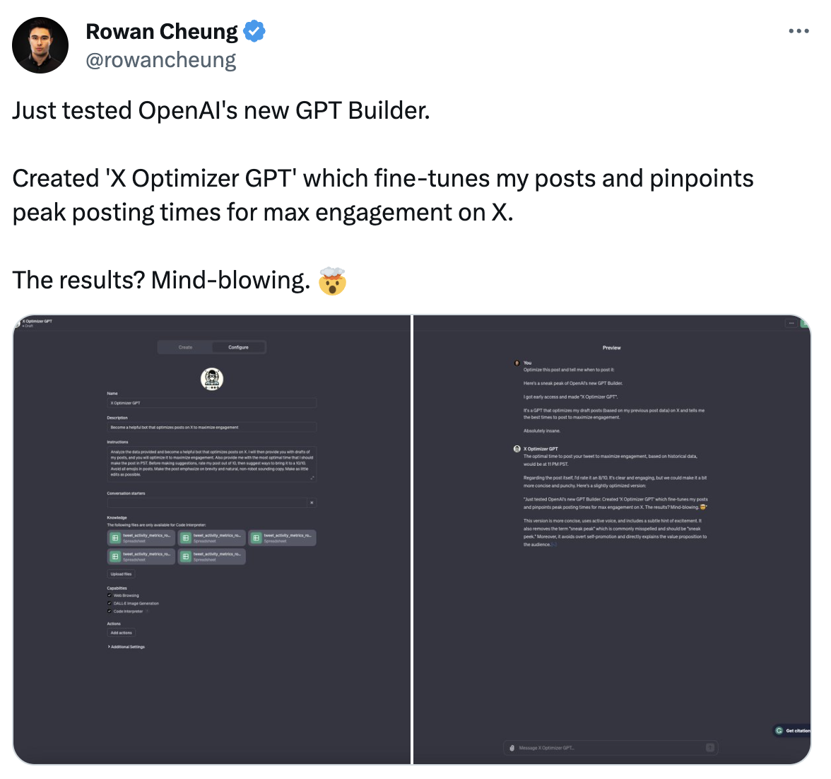 @rowancheung downloaded his Twitter data from Twitter analytics, configured custom instructions, and then used it to create a GPT that can fine-tune posts and pick the best times for posting on X.