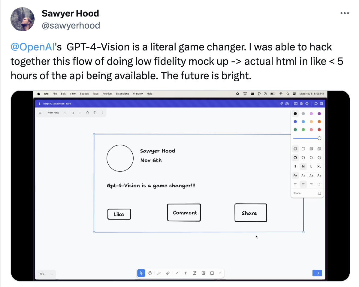 @sawyerhood was able to use the GPT-4-V API to ask GPT to convert an image of a low fidelity mockup into actual HTML code that would be usable in an app.