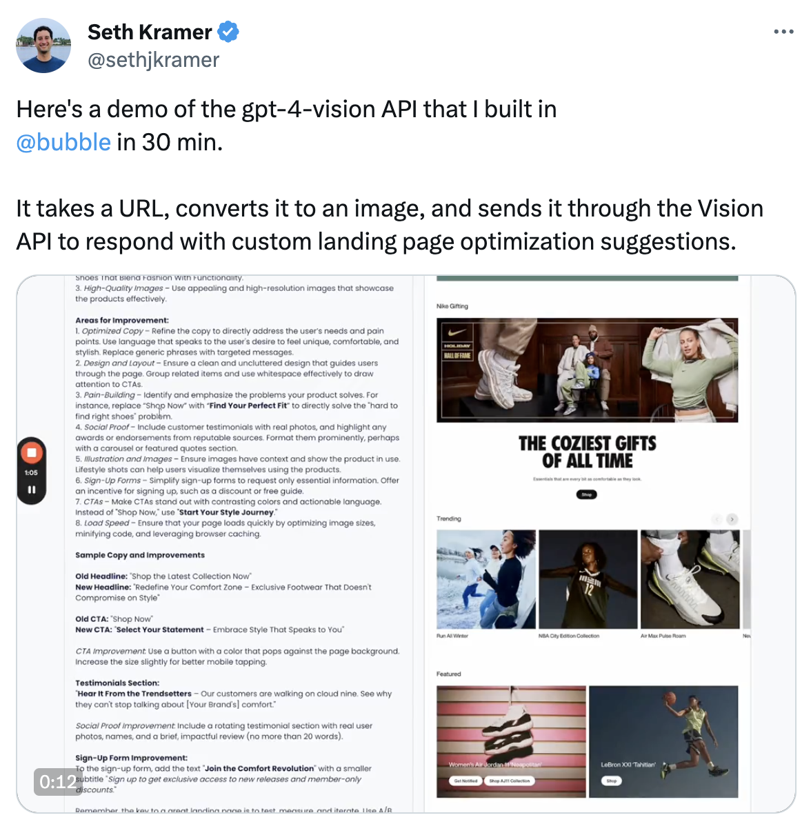 @sethjkramer created this AI app that takes a URL, snapshots it as an image, and then uses the GPT-4V API to make suggestions to improve copy, design and layout, and overall structure. Customers can then use it to quickly improve their websites. Alternatively, @marcelpociot built a tool that will pull your website and roast it (and also return the audio!).
