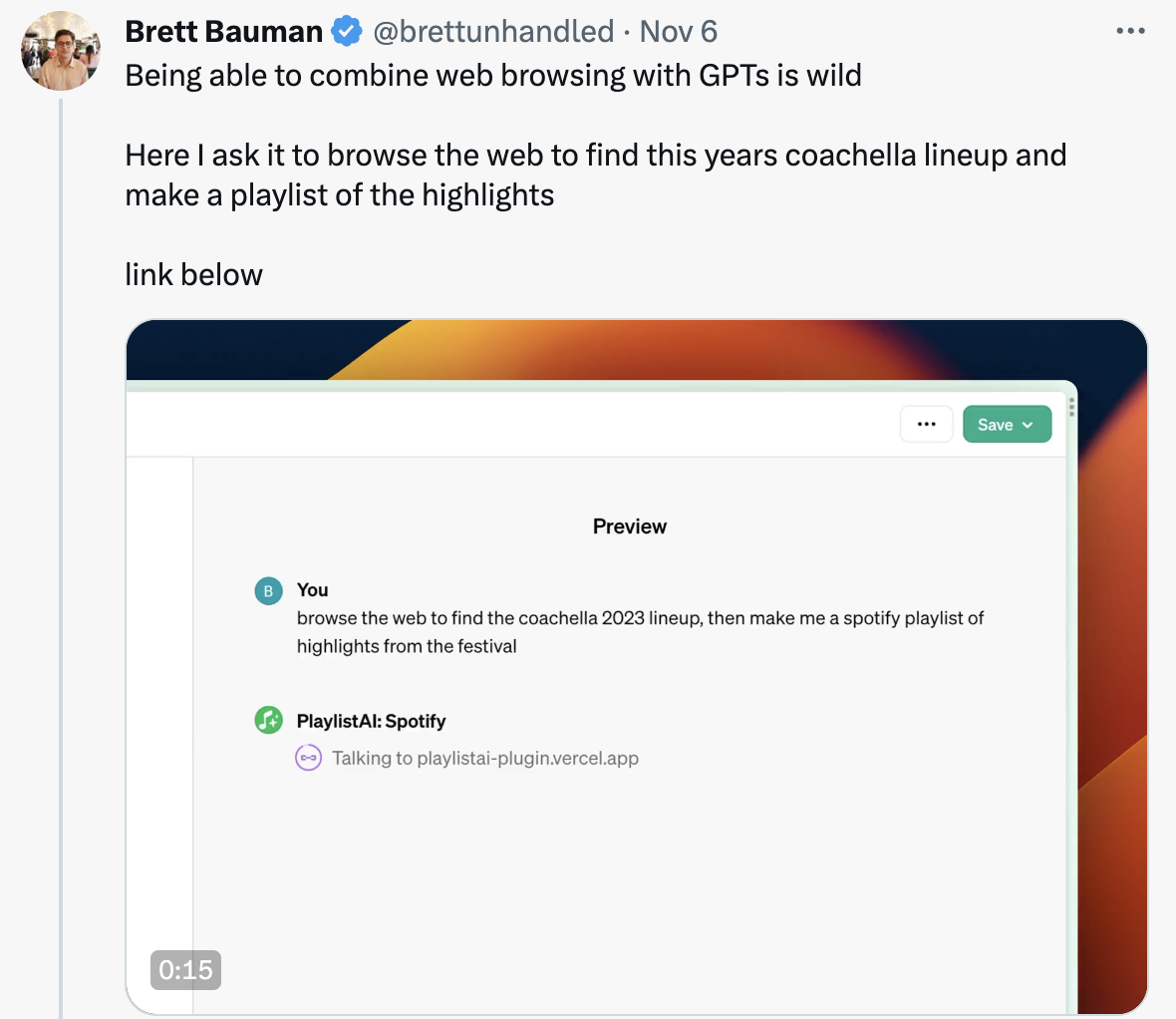 @brettunhandled added web browsing to his AI Spotify playlist builder to allow users to make queries for things such as “find the 2023 coachella lineup and make a playlist of the highlights.”