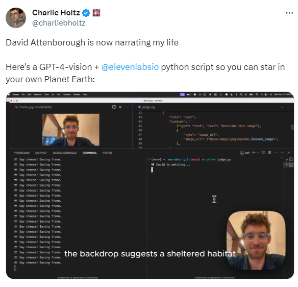 @charliebholtz built an app using GPT-4-Vision and the Eleven Labs text to speech API that uploads stills from your webcam to GPT-4. OpenAI then creates a narration in the style of David Attenborough, which is converted to speech to sound like David Attenborough is narrating your webcam.
